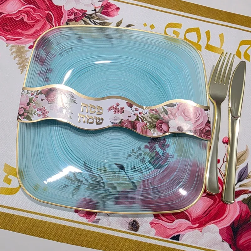 - 10 צלחות גדול "שוהם" צבע כחול שמיים עם פס זהב